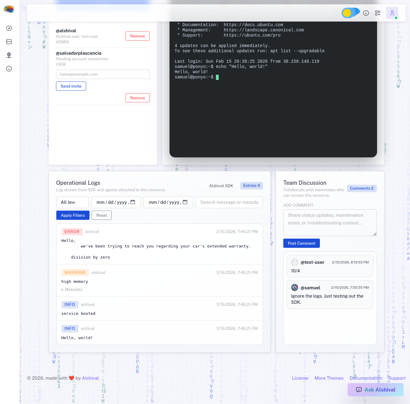 DevTools is how our team at Alshival keeps engineering work moving when systems get noisy. We monitor critical resources, centralize logs, and route alerts to the channels where teams already work. When incidents happen, Alshival helps us search logs, summarize what changed, and respond faster.